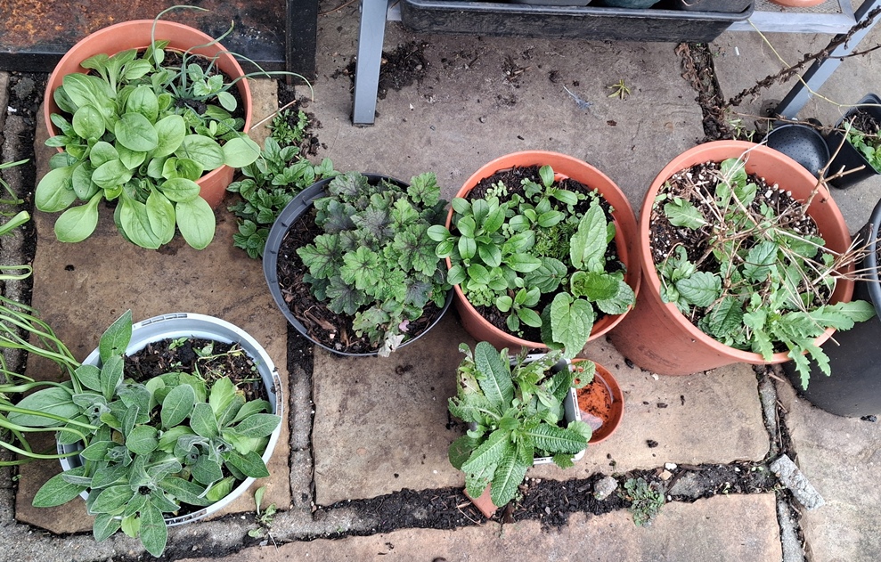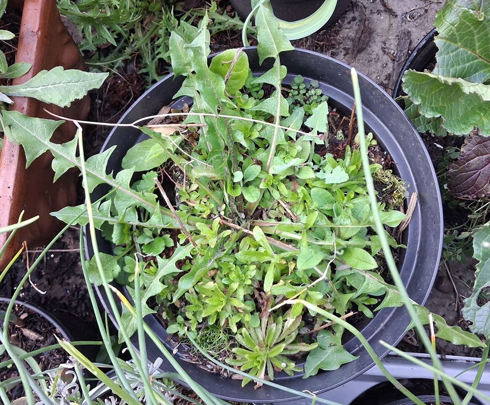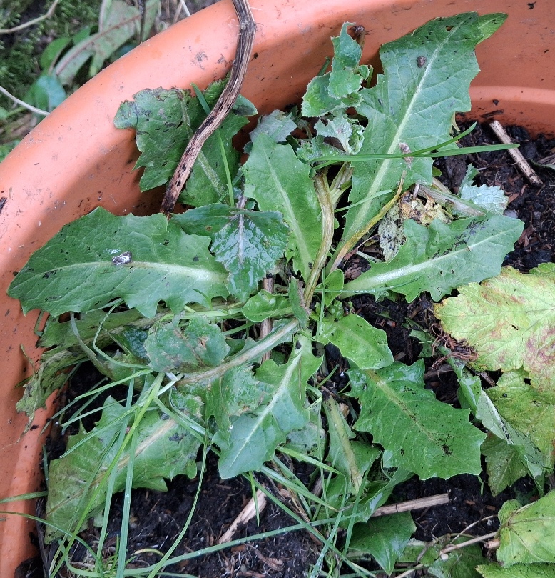 Crepis vesicaria self-seeded in a pot with a passionflower