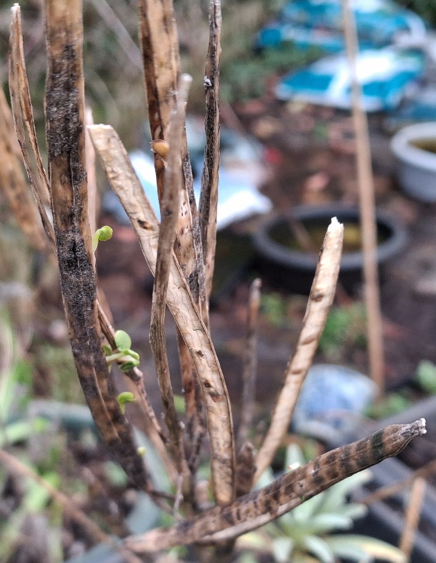 back in my garden, hoary stock buds and vivipary, seeds germinating in the seedheads on the right