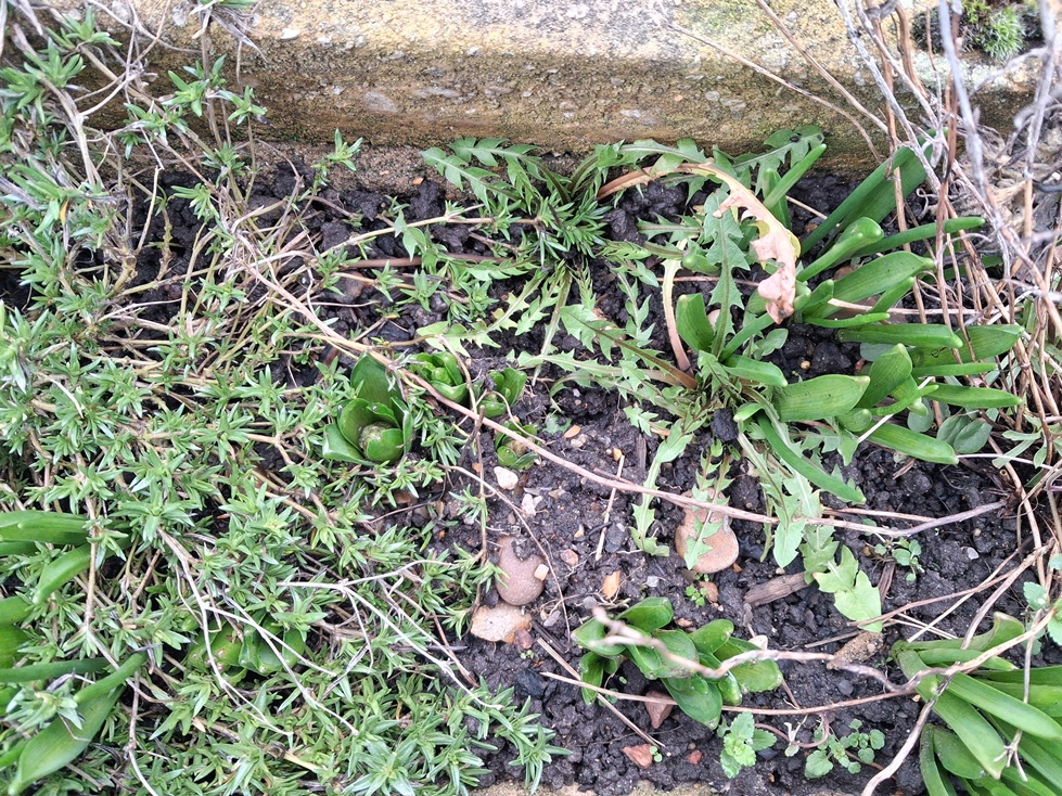 Crepis vesicaria self-seeded in a pot with an amaryllis