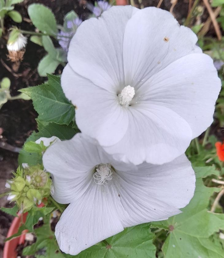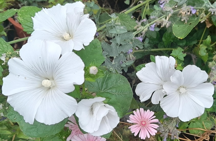 hollyhocks blooming but they're all white and pink, I have been watering them a bit as they're newly planted out but they shouldn't need watering once they're established