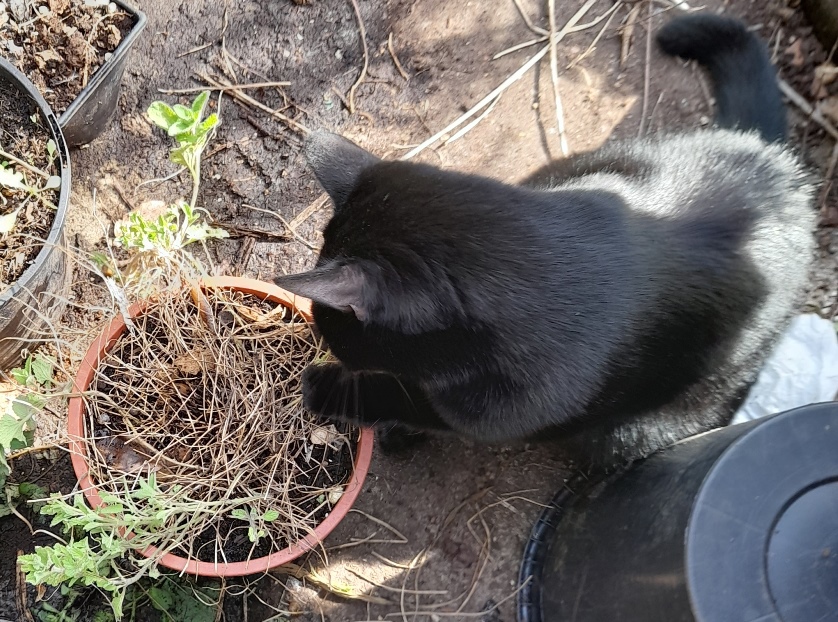 I moved some pots around to see what's growing and Rocky has come to a pot of nepeta. Lone anemone above. Had many more last year. They don't seem to last, not in my garden anyway.