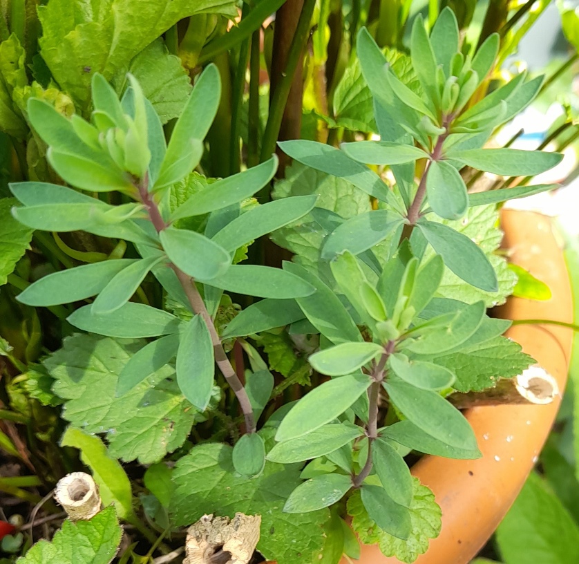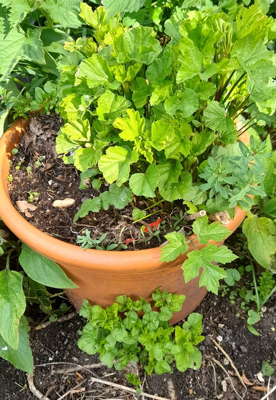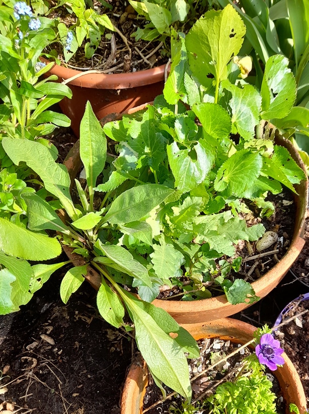 giant scabious I grew from seed last year, seems to be doing well, I removed the green alkanet from the pot, also need to remove a winter purslane and beccabunga which have self-seeded