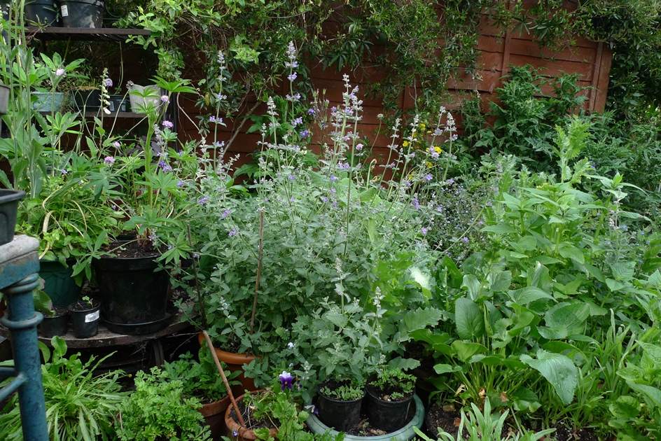 pot 2: a number of red deadnettle, 3 verbena bonariensis, one on the right I'm not certain of