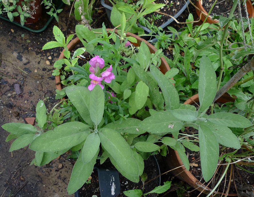pot 5: clockwise from top, snapdragon, plantain?, verbena bonariensis, poppy, forget-me-not and salvia in the middle