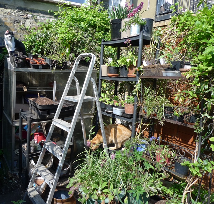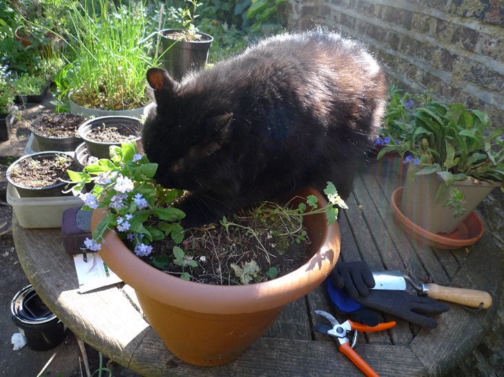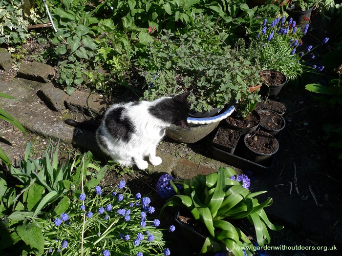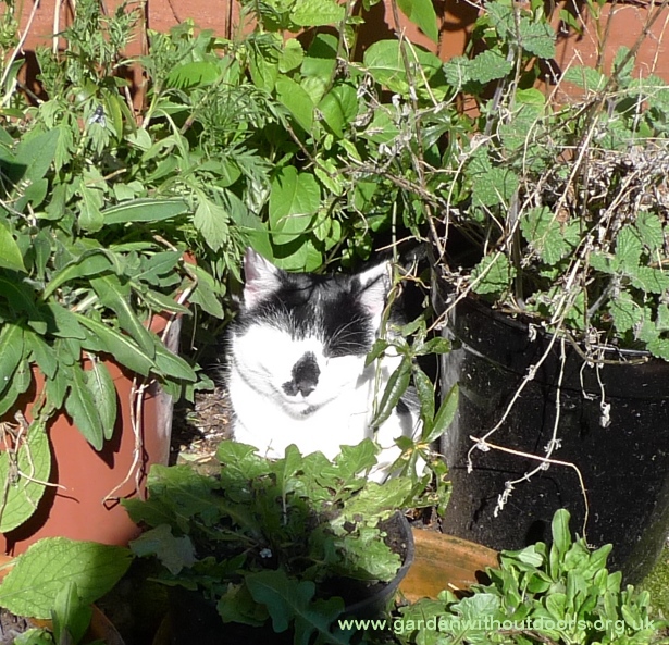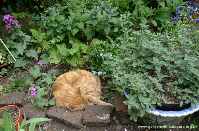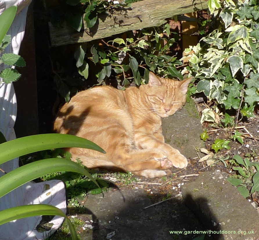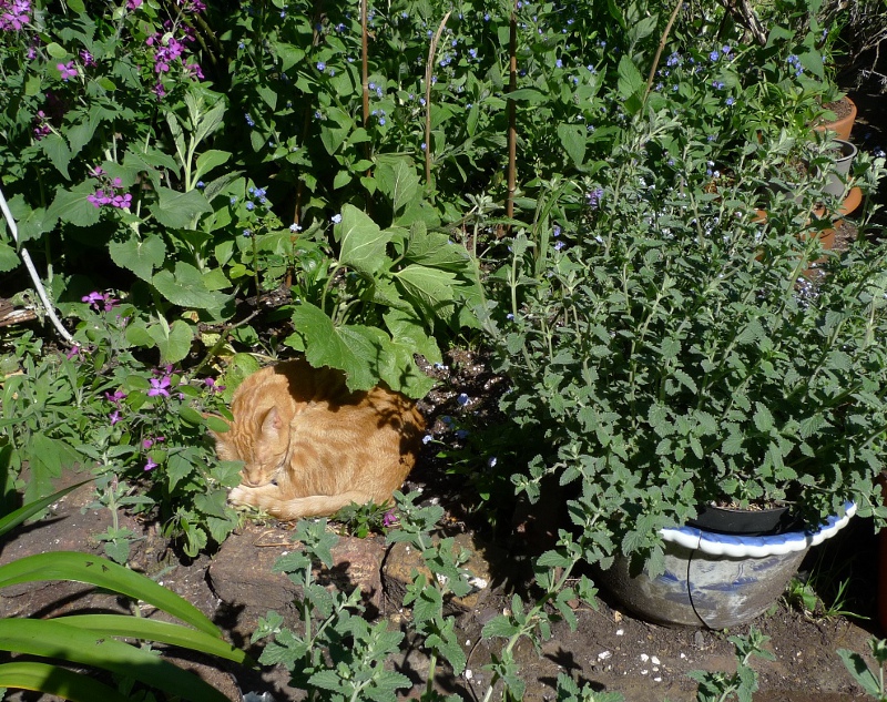 Finally dry enough to be in the garden, 3 of my 4 cats joined me, Victor using a brick for a pillow