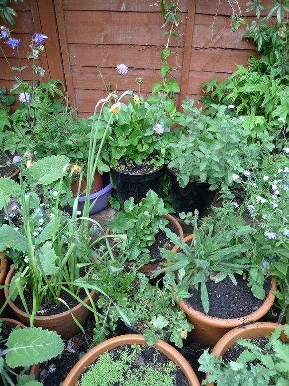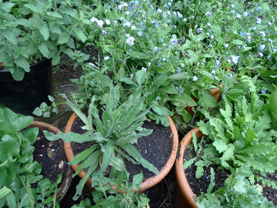 (forgot there's another pot of nepeta back left) I also love scabious and had one languishing in a small-ish pot - why not appreciating it? so planted it in that large pot with one of the echium vulgare which I love ("wildflower" from the garden centre, seed sowings of echium vulgare have yielded very little in the past), when those forget-me-nots to the right have finished (I've seen bees on them) that pot will get something new