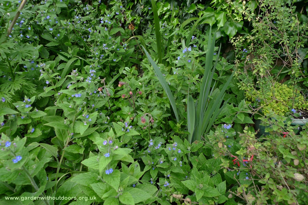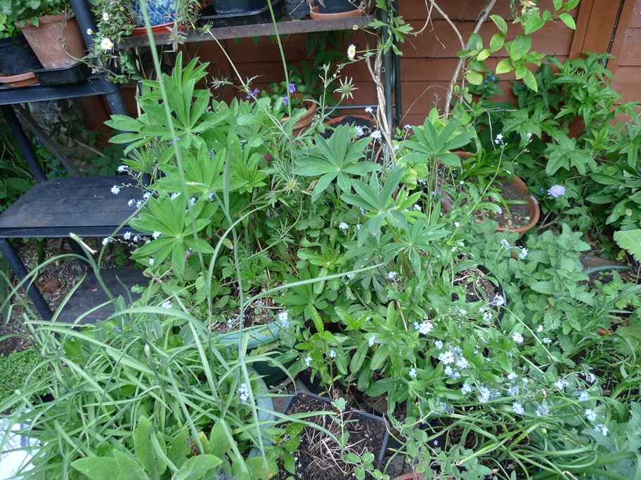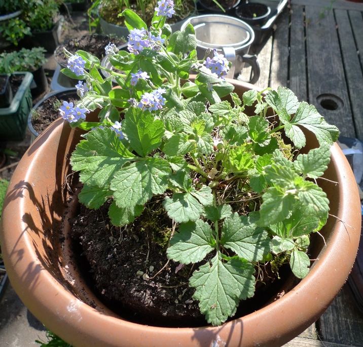 With fewer smaller pots and fewer seedlings, watering should be easier. I have lots of pots with self seeders and am trying to make better use of them. This one has forget-me-not, a wood avens and I discovered nepeta in the middle.