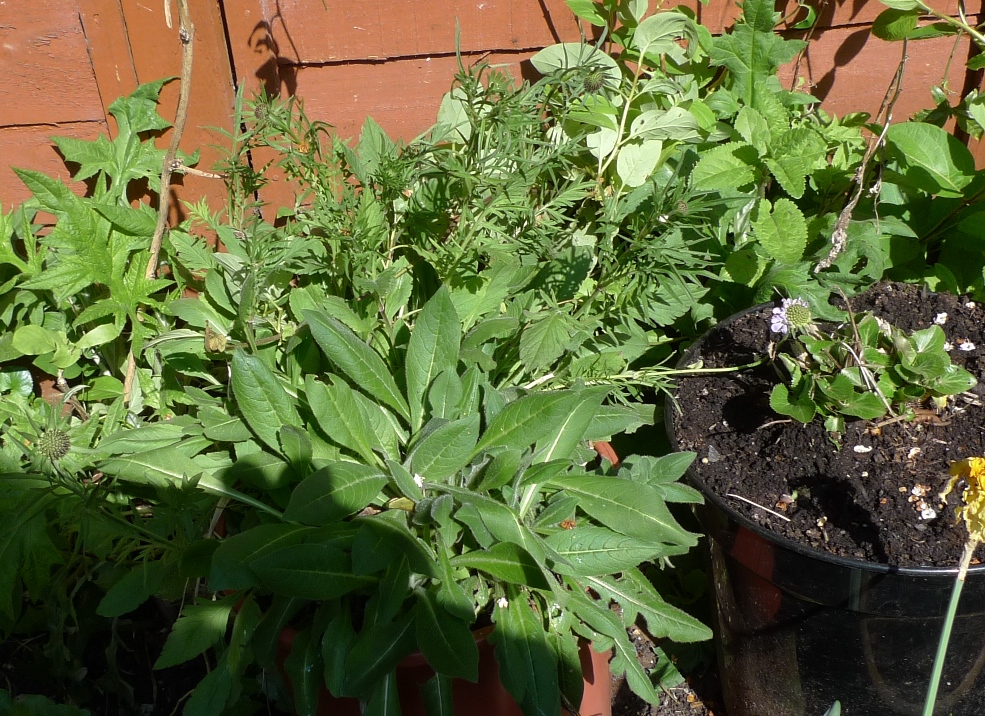I have enough globe thistles and I have enough small plants for my neighbour so decided to stop potting them up and dispose of those I don't want. I find disposing of plants challenging, in some ways, I'm a novice gardener. So no more globe thistles. Or wild basil. I'm removing from pots these plants (wild basil, forget-me-nots, red deadnettle, wood avens, etc) I don't want and just putting them in the garden - on top to save digging or just putting in the compost pile (globe thistles).
