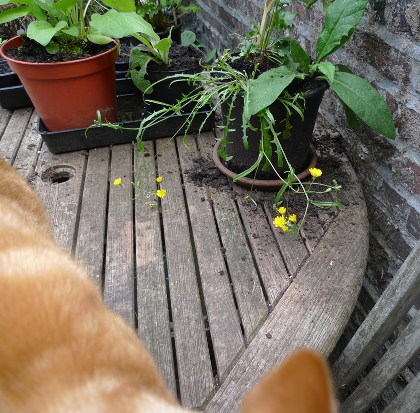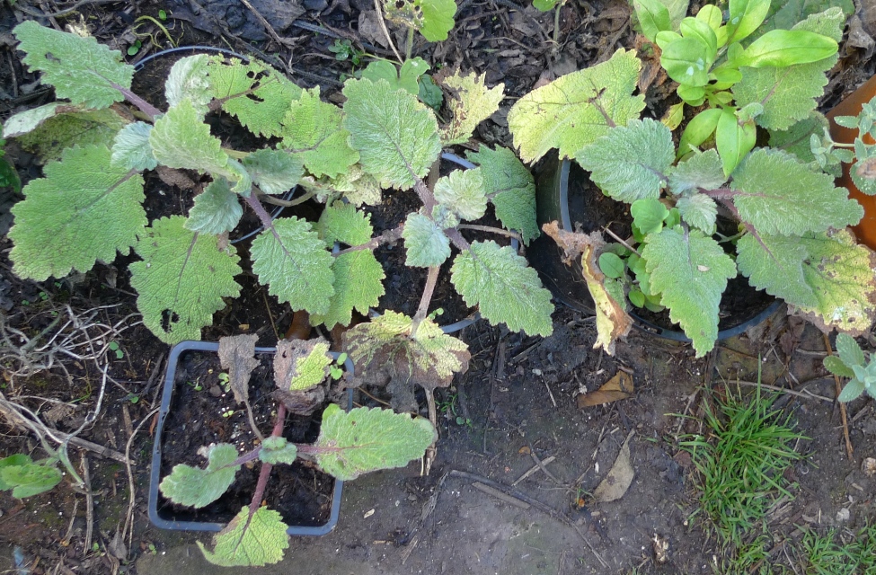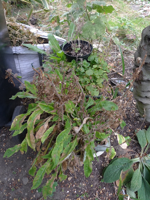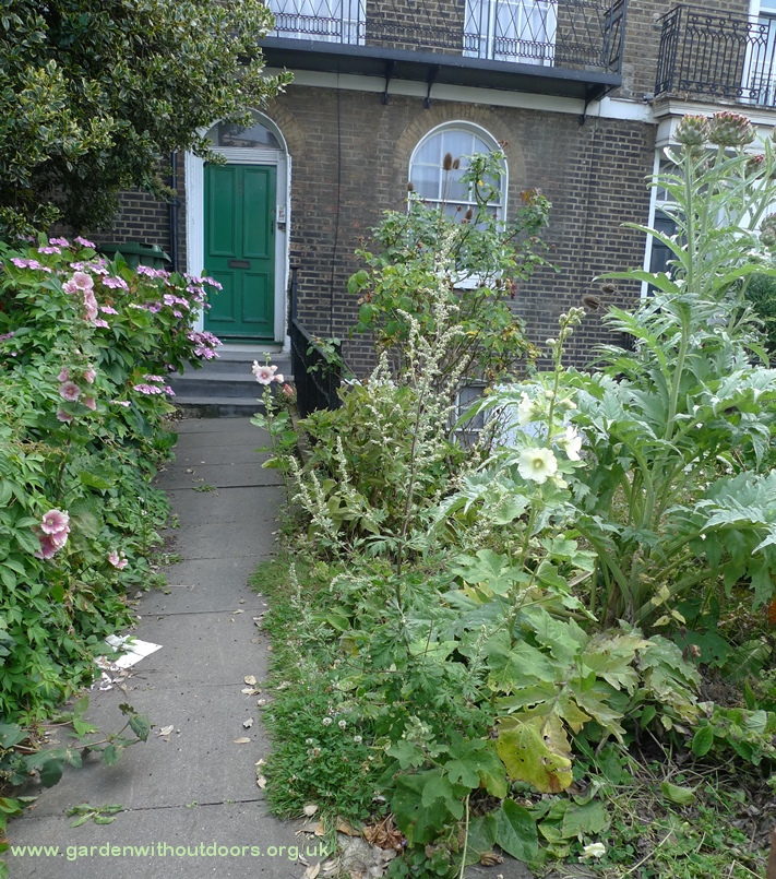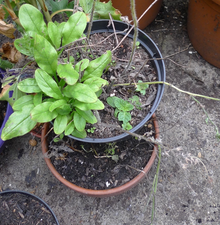 hollyhocks used to be the star of the garden next door but the hollyhock weevil seriously reduced numbers, I am trying to grow some replacements from seed but the slugs are seriously damaging the seedlings, I am going to try keeping them in pots until they are larger and maybe able to survive? mugwort to the left