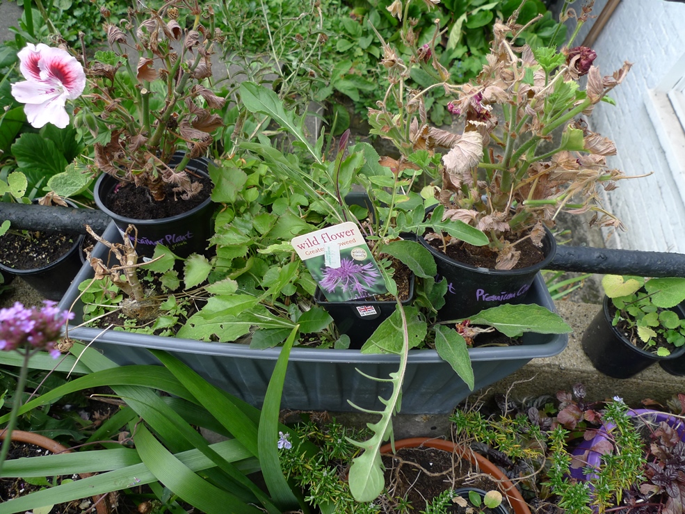 My greater knapweed seem to be struggling a bit, I guess the environment isn't great, a shallow flowerbed that isn't watered enough (I can't water the garden except for pots) but at least a bee is there.