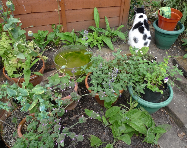 some hyacinths and borage in bloom, lupin small plant from late last year's sowing to the right, sea holly both in pot and in the ground in the back, also the ubiquitous green alkanet, forget-me-not and snapdragons