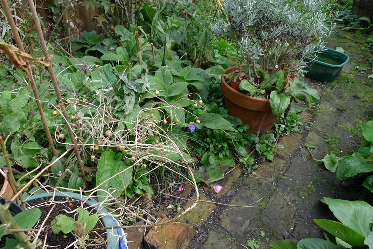 hosta sprouts coming through on this one, again leaving the forget-me-nots to bloom before removal