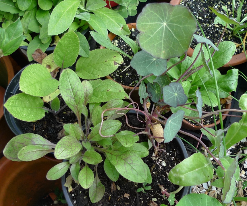 I'm still intrigued with red plants and what causes them. I have lots of forget-me-nots as they are a very stong self-seeder and I like them (ie I don't pull them out) but I have never seen one so red-tinged as this one. Coincidentally the nasturtium on the right is one of the darker-leaved variations I have. Does that have anything to do with the forget-me-not? I don't know.