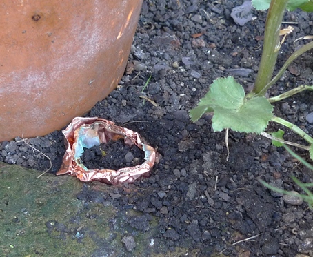 that slug-eaten sea holly is to the left below, I've put that copper tape in a ring around it to stop the slugs eating it