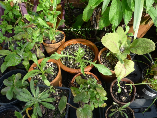 an update on some of my seedlings: that oenothera in the middle before I repotted it, the chicory behind it looking like giant dandelions (must get them planted in the ground but worried about the slugs), nepeta on the left, polyanthus to the right of the nepeta, scabious on the right, so far just upright leaves