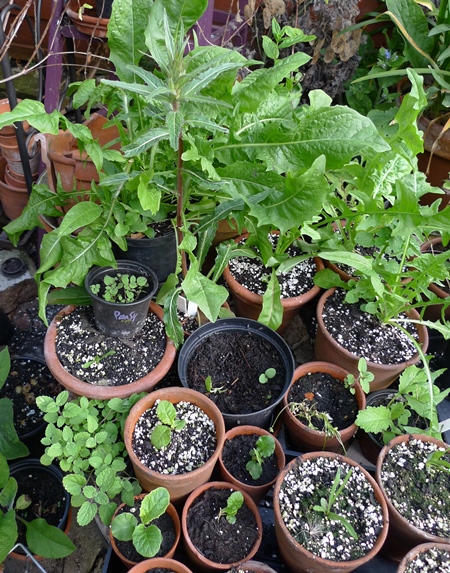 I'm not sure how so many seeds get into a small pot like this but they seem to have. I see grass, green alkanet, cerinthe, viola, lesser knapweed, foxglove, maybe centaurea montana. I will try to repot and give them all more room.