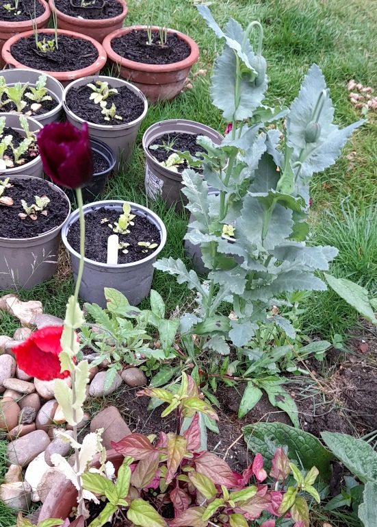 First Lauren's Grape poppies in bloom from self-seeding, not sure when they self-seeded but some time last year. I did plant some seeds but the seedlings are miniscule. It's been so cold this spring, my seedlings (from seeds that actually germinated)  are so small I can't imagine I'm going to see any flowers from them this year.