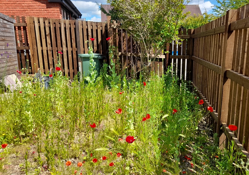 18-8-2024 I tried growing sunflowers from seed but they did not do very well and were eaten by slugs. I shared my few survivors. So thank goodness sunflowers self-seeded from bird seed have performed very well. One is taller than the bird feeder.