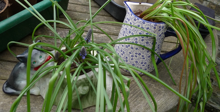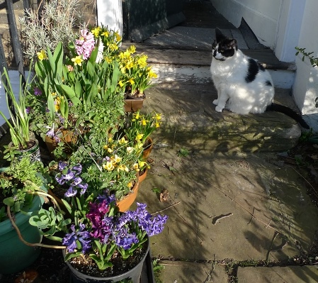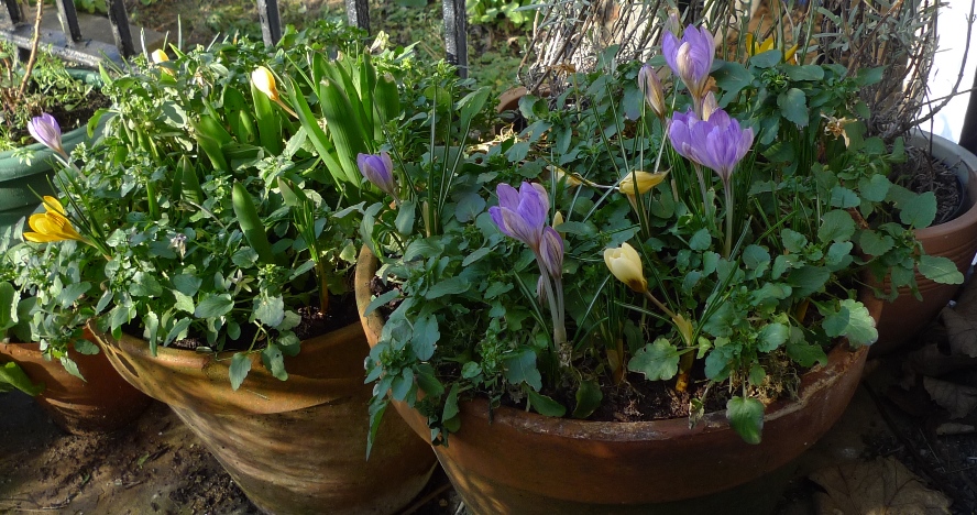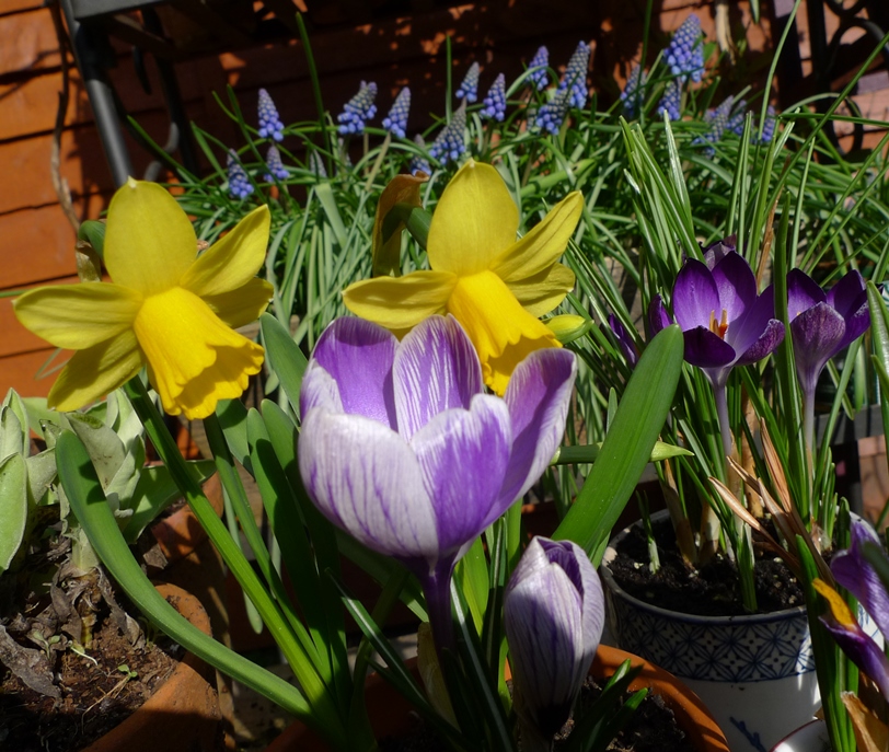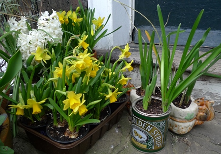 The golden syrup tin on the right and the squirrel planter to the right of that have tete-a-tete daffodils and have been indoors since I planted them up last autumn, none of which are showing any buds whereas the pots to the left and in bloom and looking fabulous have been outside since being planted up with tete-a-tete daffodils last autumn.