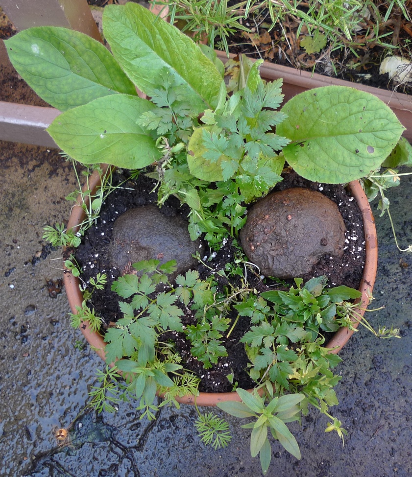 I bought these large cyclamen coum tubers at the garden centre as I was intrigued and had never grown one before. Since this pic was taken I have planted them properly in pots covered with soil. One from this pot had been carried off by a fox and left at the bottom of the garden. I guess he decided it didn't taste or smell intereresting.