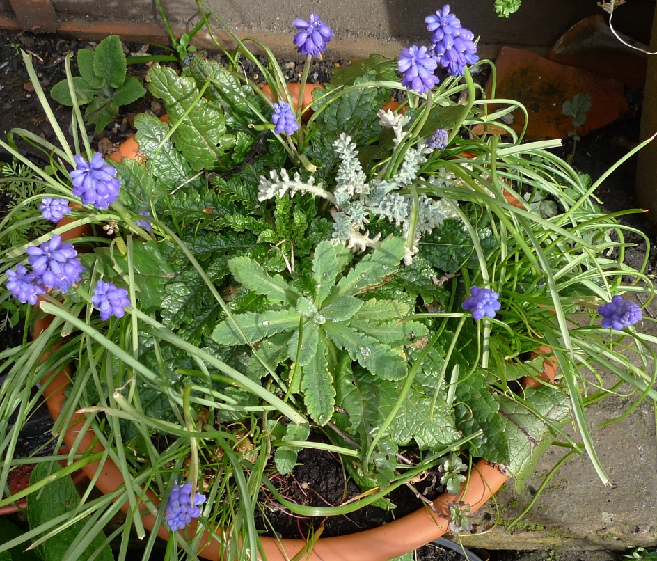 Focus on the pot above filled with self-seeders: in the middle a poppy, silver grey ???, bright green very puckered/textured plant top-half that looks similar to teasel but without any roughness and muscari, of course.