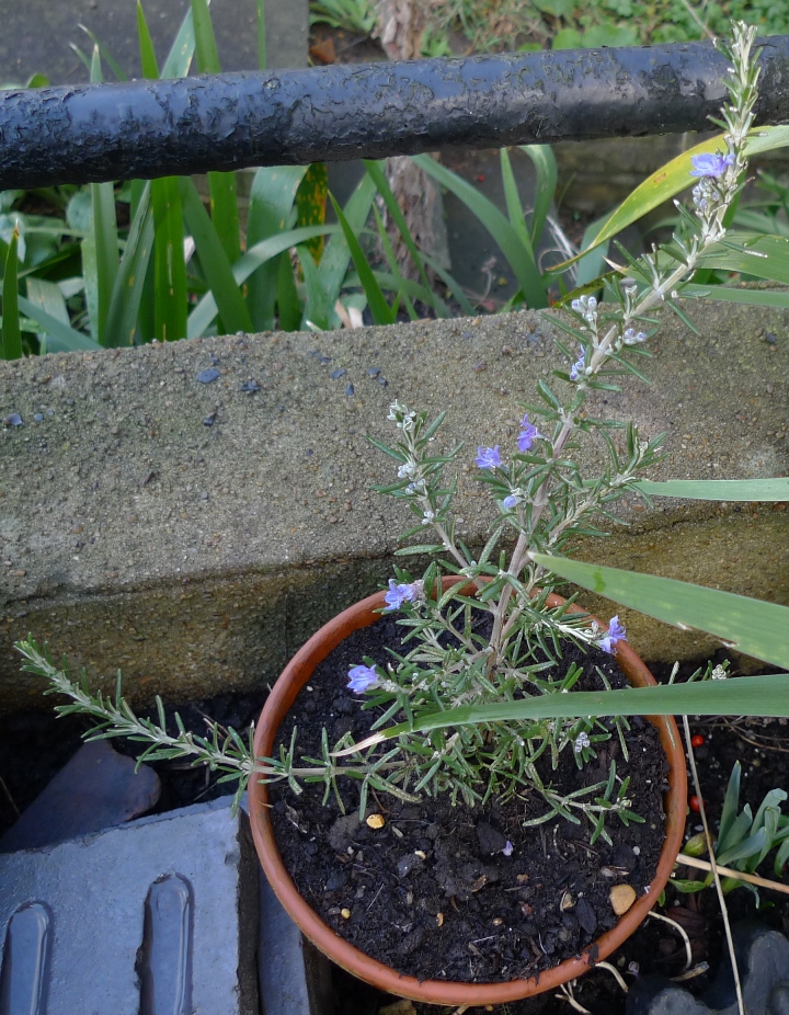 This has appeared from the large self-seeded pot, below. I'm not sure what it is. I guess it could be rosemary, the leaves look similar but I don't recall the rosemary having bloomed before. Funny this small plant decided to bloom if the much larger plant I have hasn't, it's just visible in the pic above, above the pot.