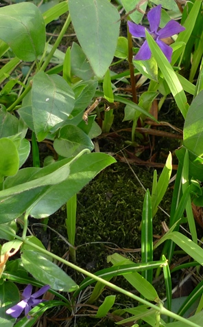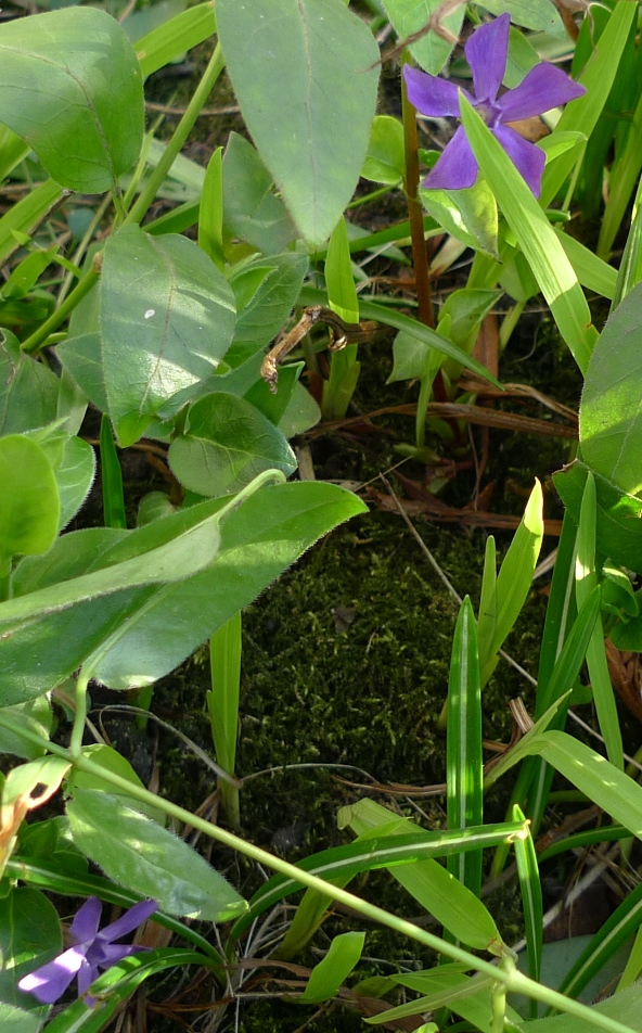 crocus surrounded by self-seeded poppy to the left, green alkanet to the right and vinca all around, after removing the invasive bluebells last year, it seems the environment was well-suited to the vinca going mad