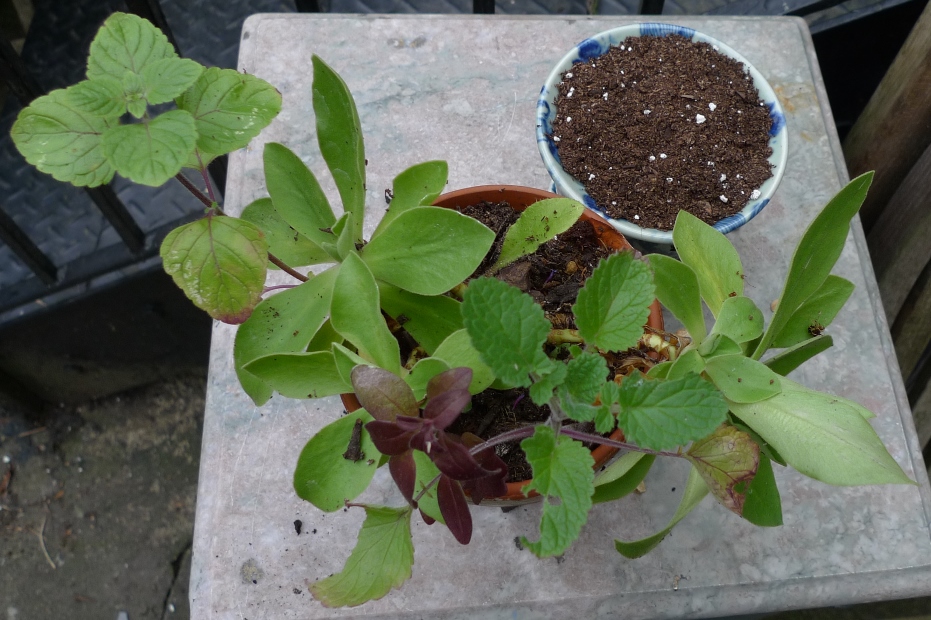 I still don't know what is on the left, also two auriculas, red snapdragon and cat nip.