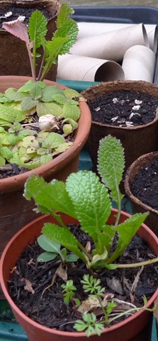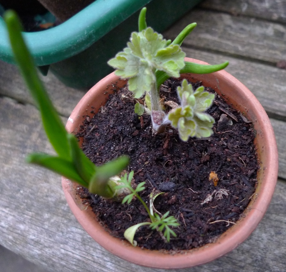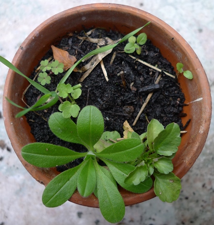 I have lots of things self-seeding in pots, both weeds and plants I want: oxalis on the left, then couch grass, forget-me-not in the middle at the bottom, pansy to the right. I think that's a delphinium in the middle but will wait and see. Not sure if some of these will last the winter but I will try to keep them until spring.