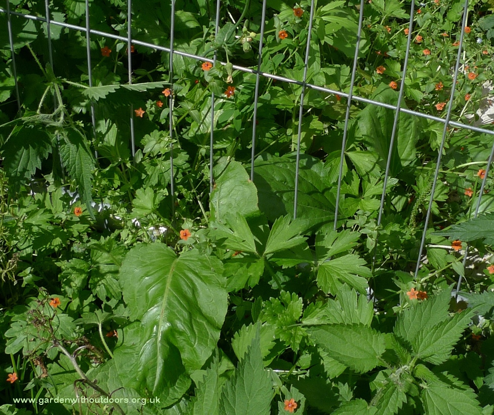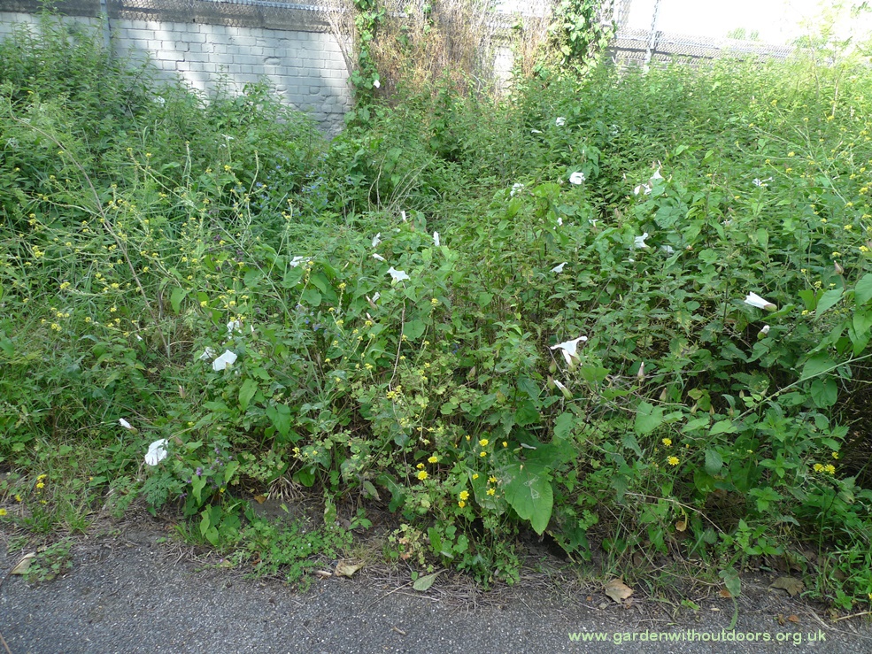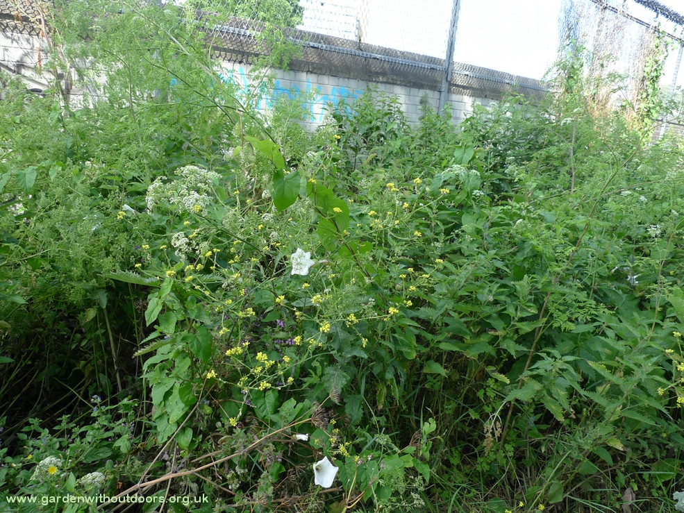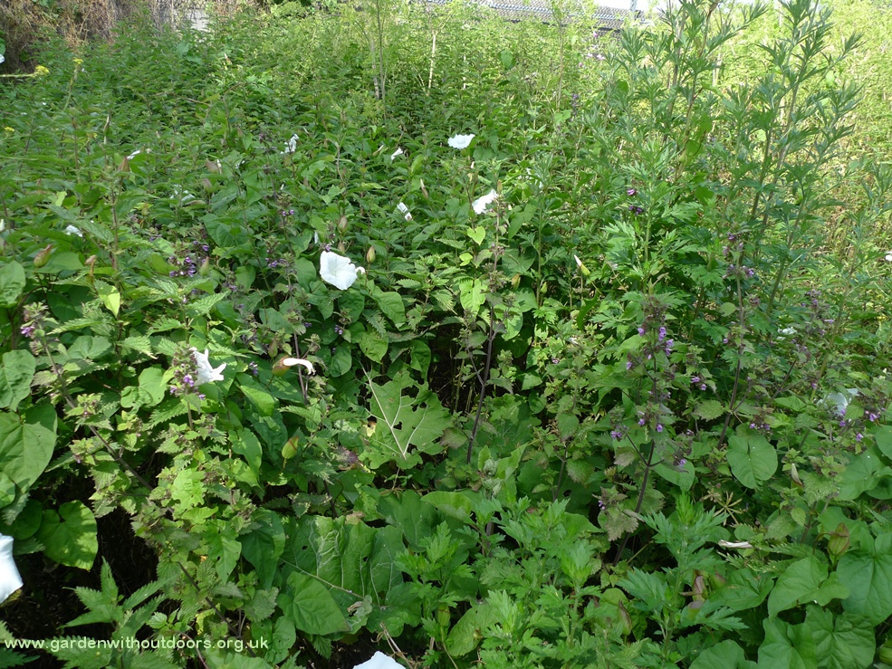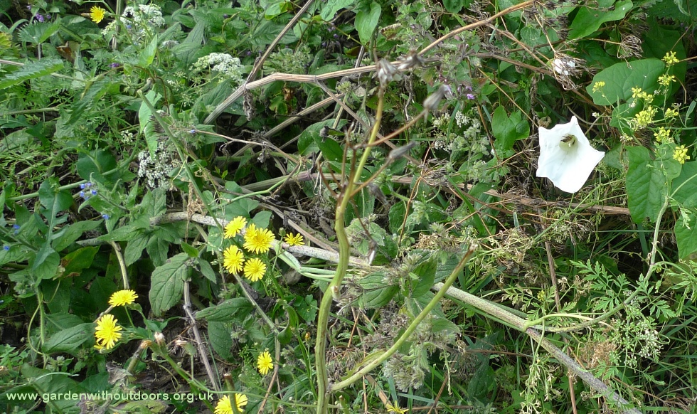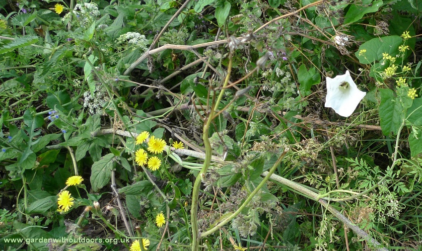 hemlock, bindweed (with a bee in one of the flowers), hoary mustard, green alkanet, stinging nettle