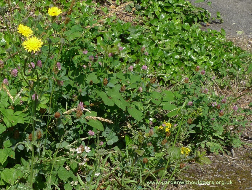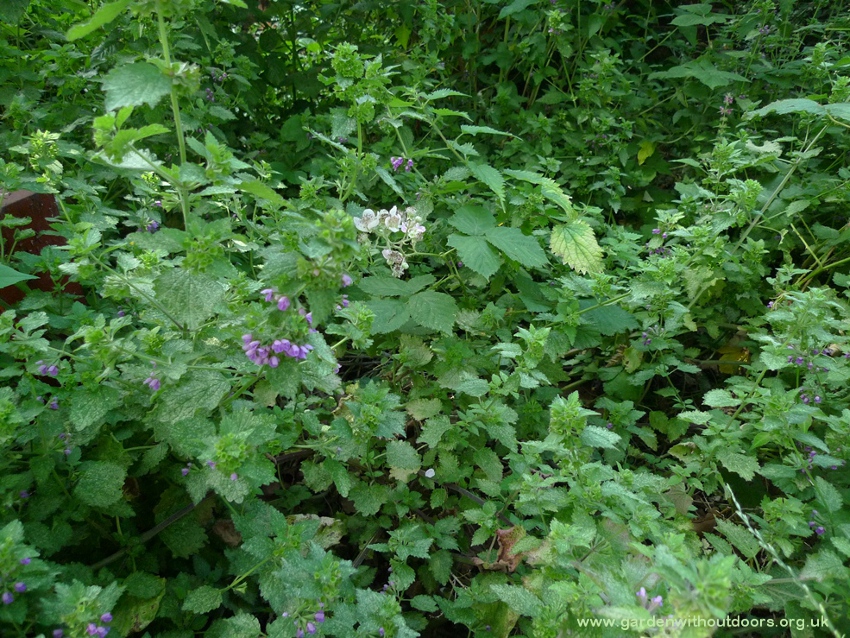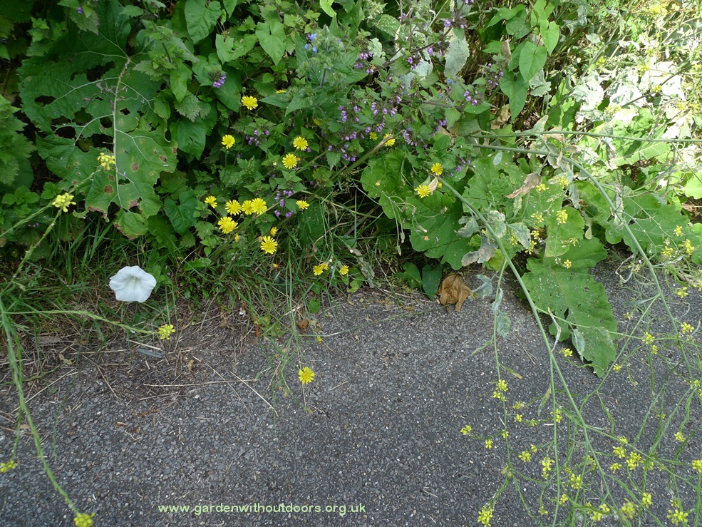 purple black horehound flowers, buddleja buds on the left, yellow nipplewort in the centre, white bramble flowers on the right