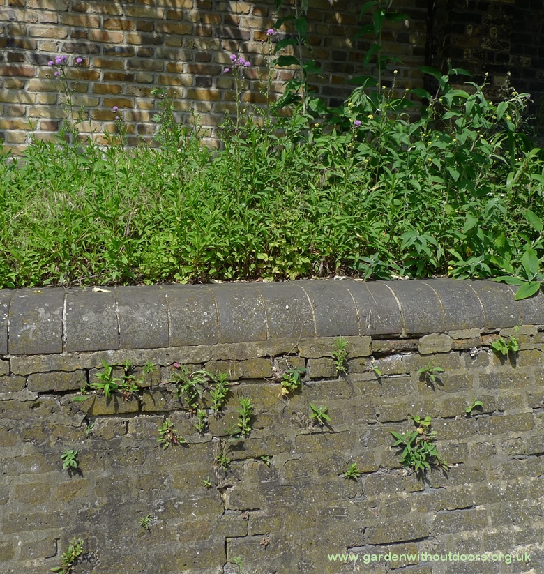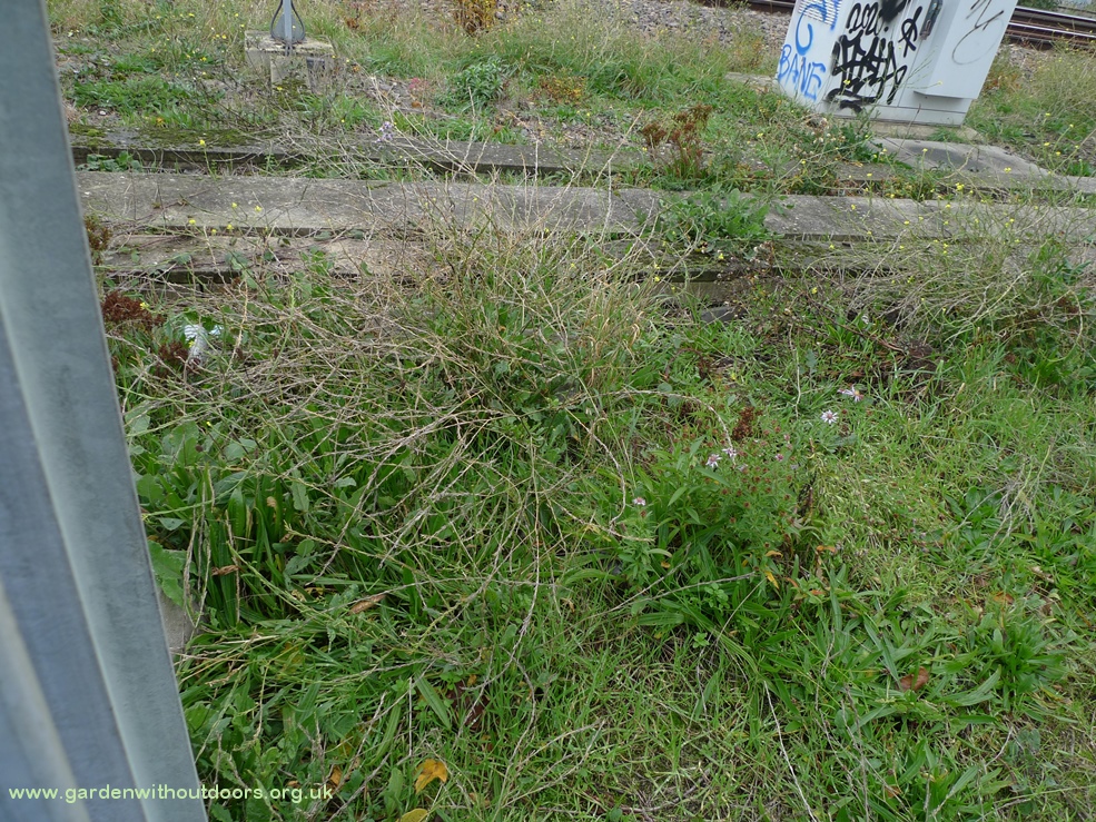 this pedestrian bridge over the railway lines creates a sheltered environment for self-seeding plants: hoary mustard, narrow-leaved ragwort, hawkweed ox-tongue, red valerian, round-leaved crane's-bill, small-flowered crane's-bill, etc