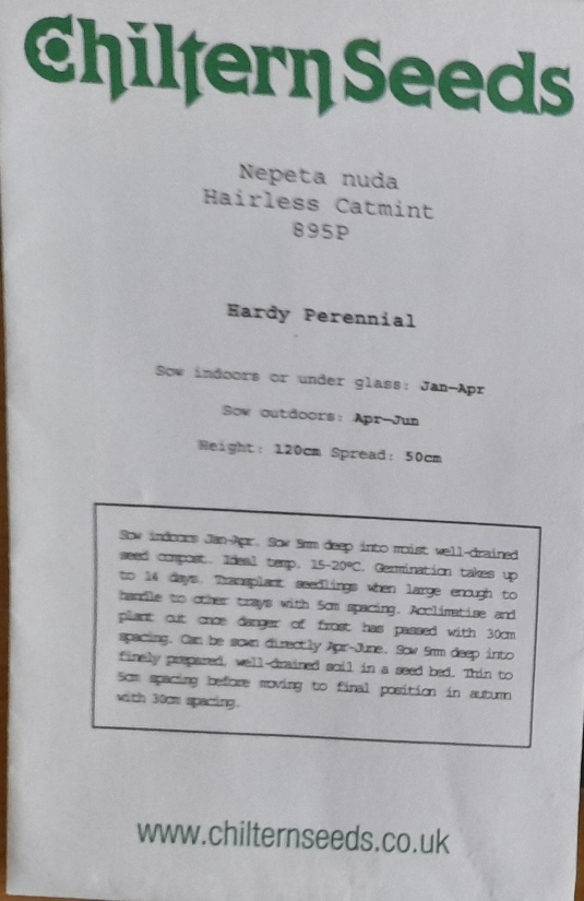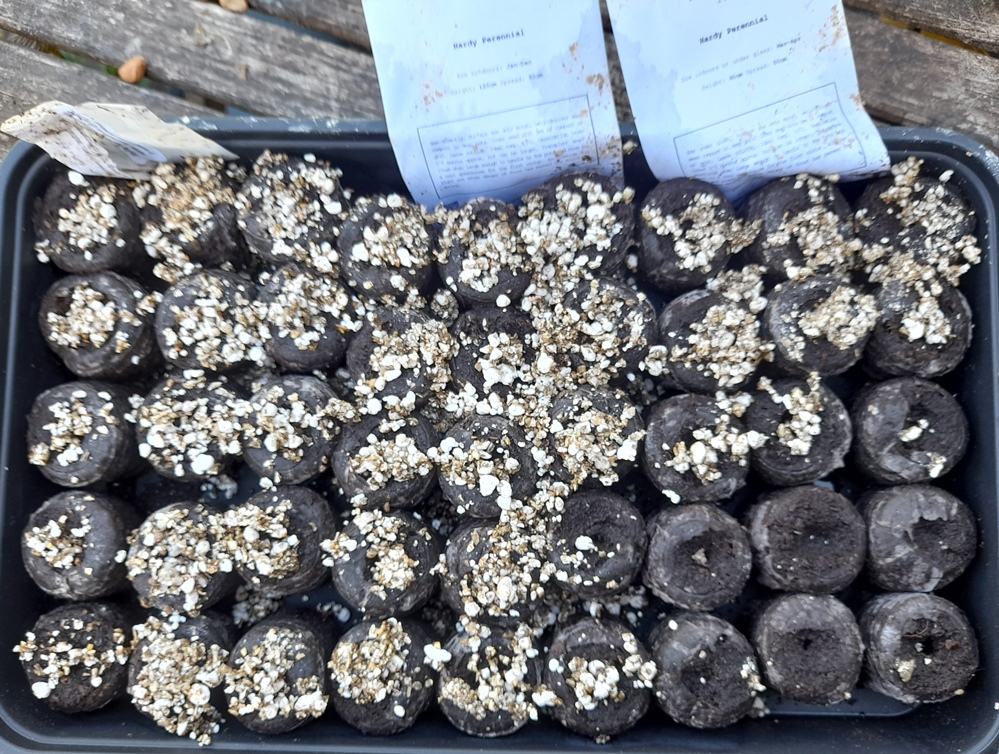 seeds sown 2-4-2024, 12 fibre pots to the right in the Nepeta nervosa / nuda tray shown above