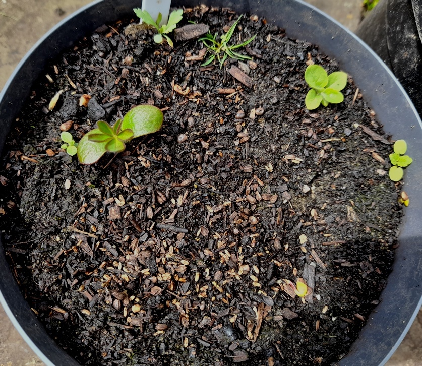 28-3-2025 the sheepsbit pots (lower round pots) have been overwhelmed with self-seeders